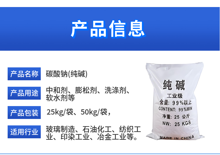 2、用于化工、冶金等。使用重質(zhì)純堿可以減少堿塵飛揚、降低原料消耗、改善勞動(dòng)條件,還可提高產(chǎn)品質(zhì)量,同時(shí)減輕堿粉對耐火材料的侵蝕作用,延長(cháng)窯爐的使用壽命。